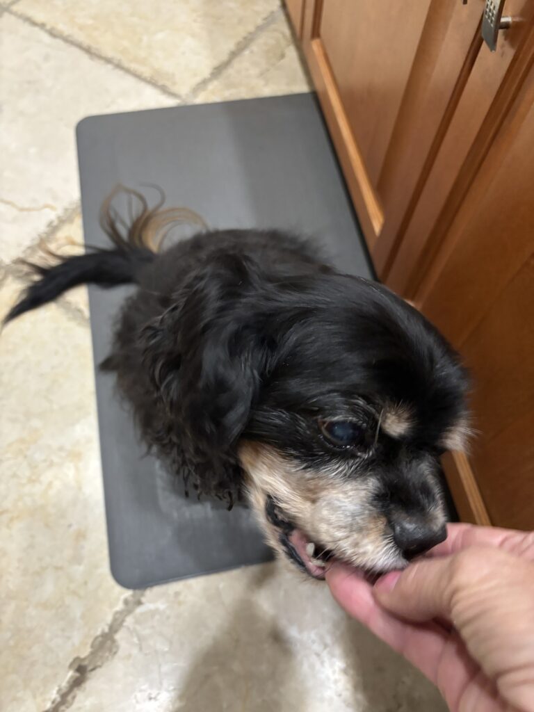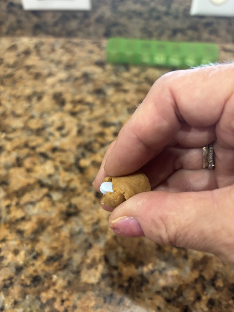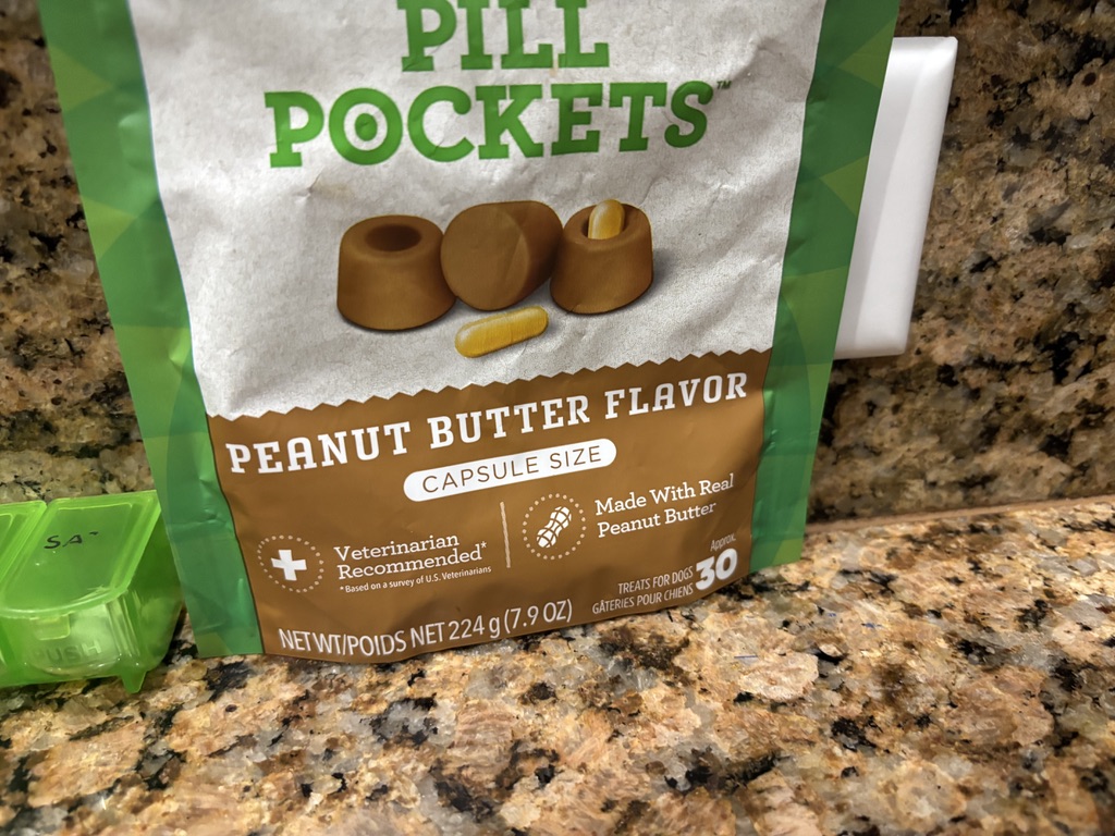 Since our dog Oliver started anti-seizure medication, we have needed to disguise his pills, so he will take them. He is given his medication three times a day. We have used cheese, but it has to be soft cheese. When we take the dogs with us, we want something that doesn’t need to be refrigerated.