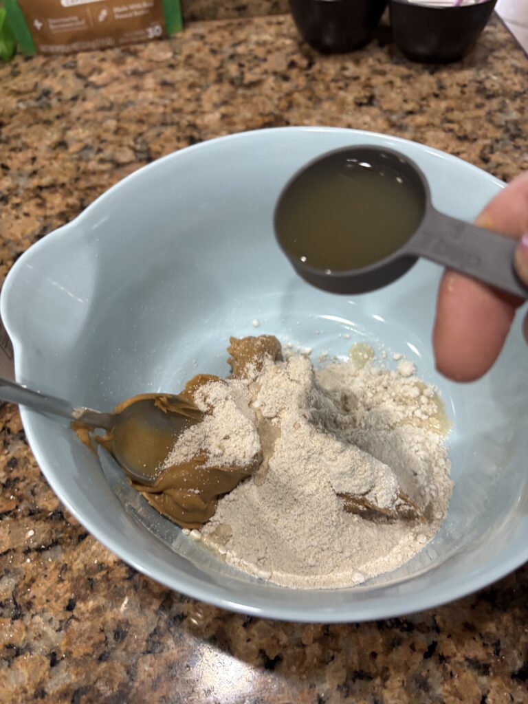 Combine the oat flour and peanut butter. Add water or broth 1 tablespoon at a time. The mixture should feel like dough. Add more flour if sticky.