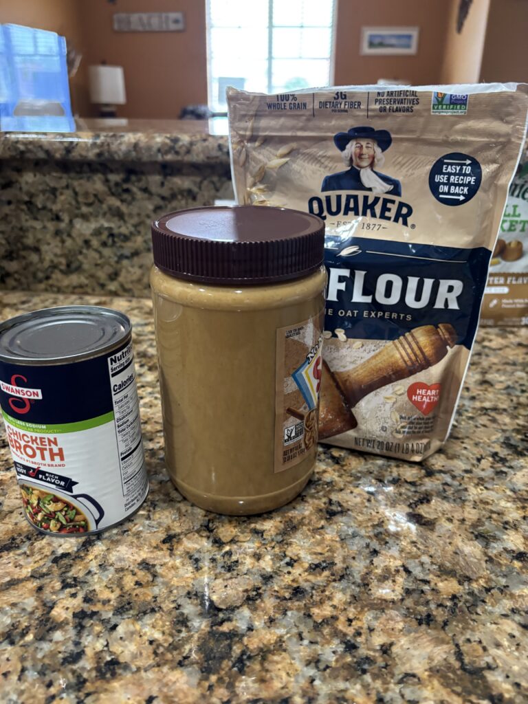 2/3 cup natural peanut butter- Make sure there is no Xylitol in it. This is harmful to dogs.