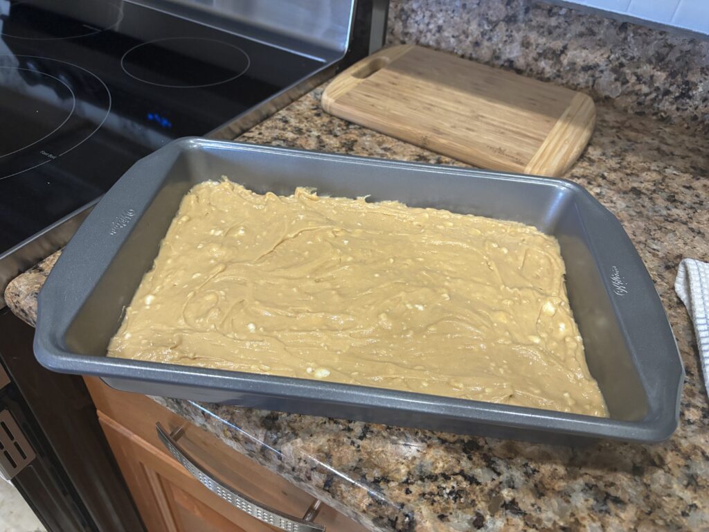 Pour the batter into the prepared cake pan. Smooth out the batter.