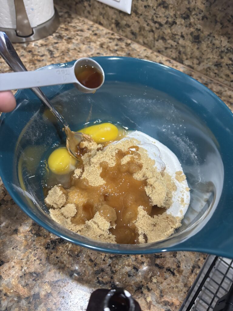 Add the eggs and then stir in the vanilla extract.