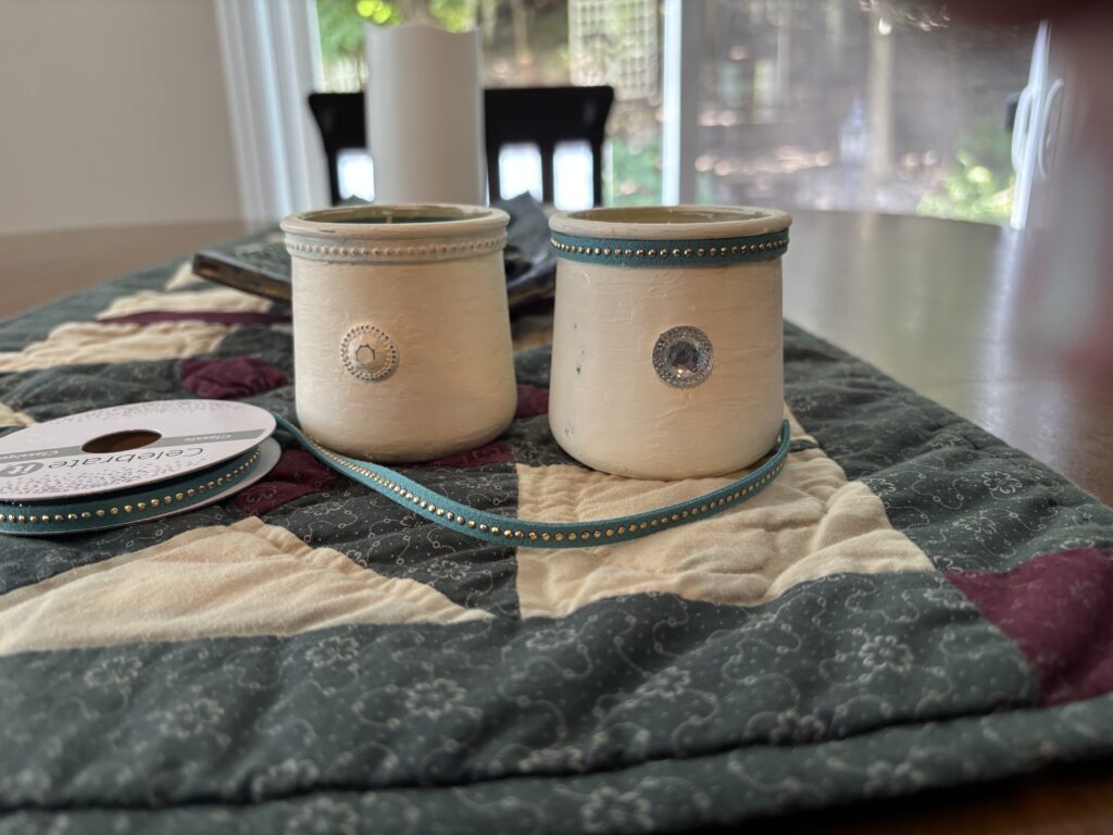 Now measure the ribbon, cut to fit around the glass. Then, glue in place. I used a gem for the front. You could use a flower or any number of items. Let the glue dry for a couple of hours.