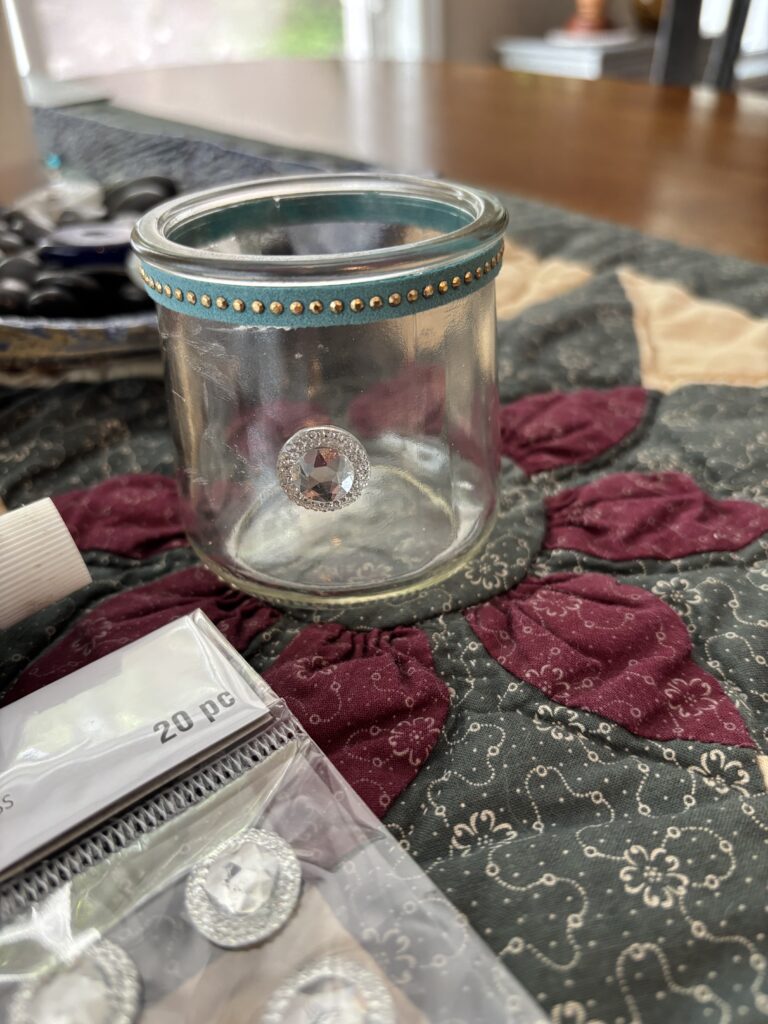 Pick up embellishments to add to the outside. I used E6000 clear adhesive to glue the embellishments to the glass.