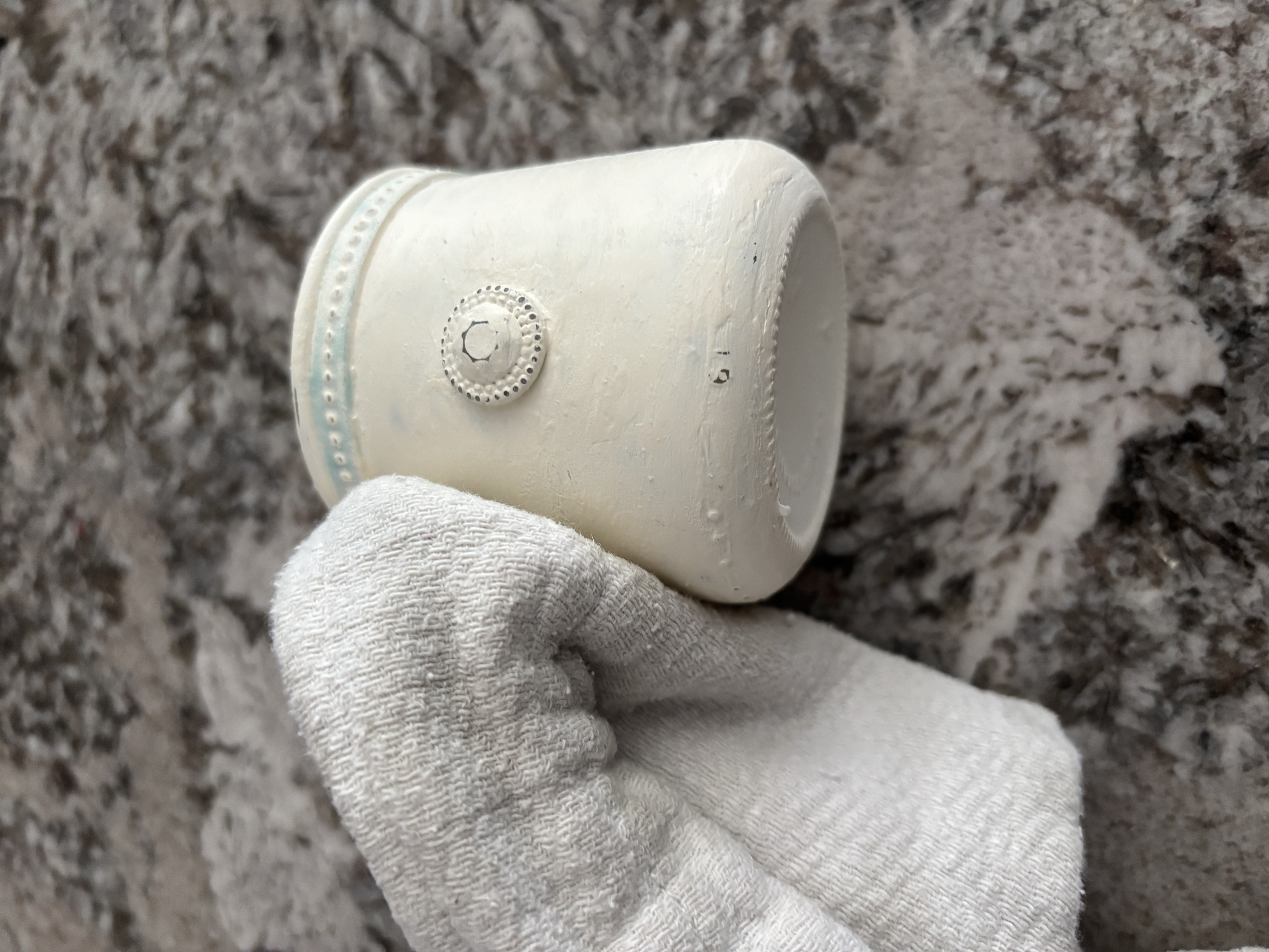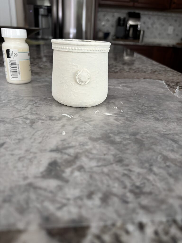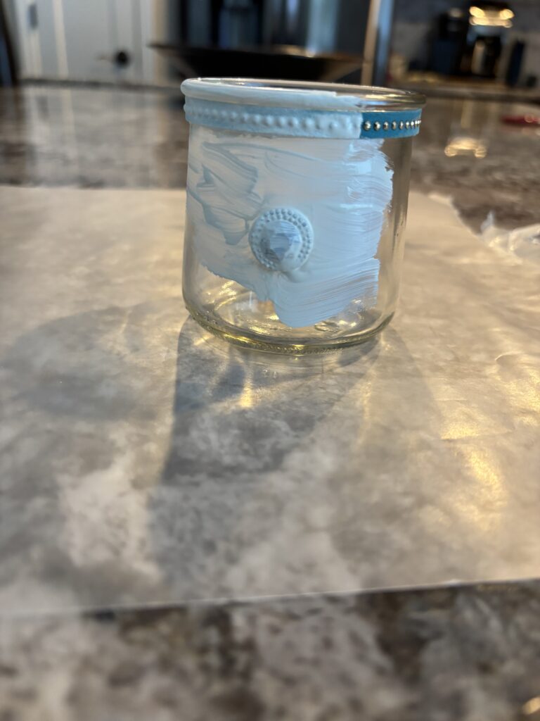 Using a craft brush, brush a thin coat of chalk paint on the glass. Cover the embellishments with paint as well. Let it dry for a couple of hours before applying a second coat.
