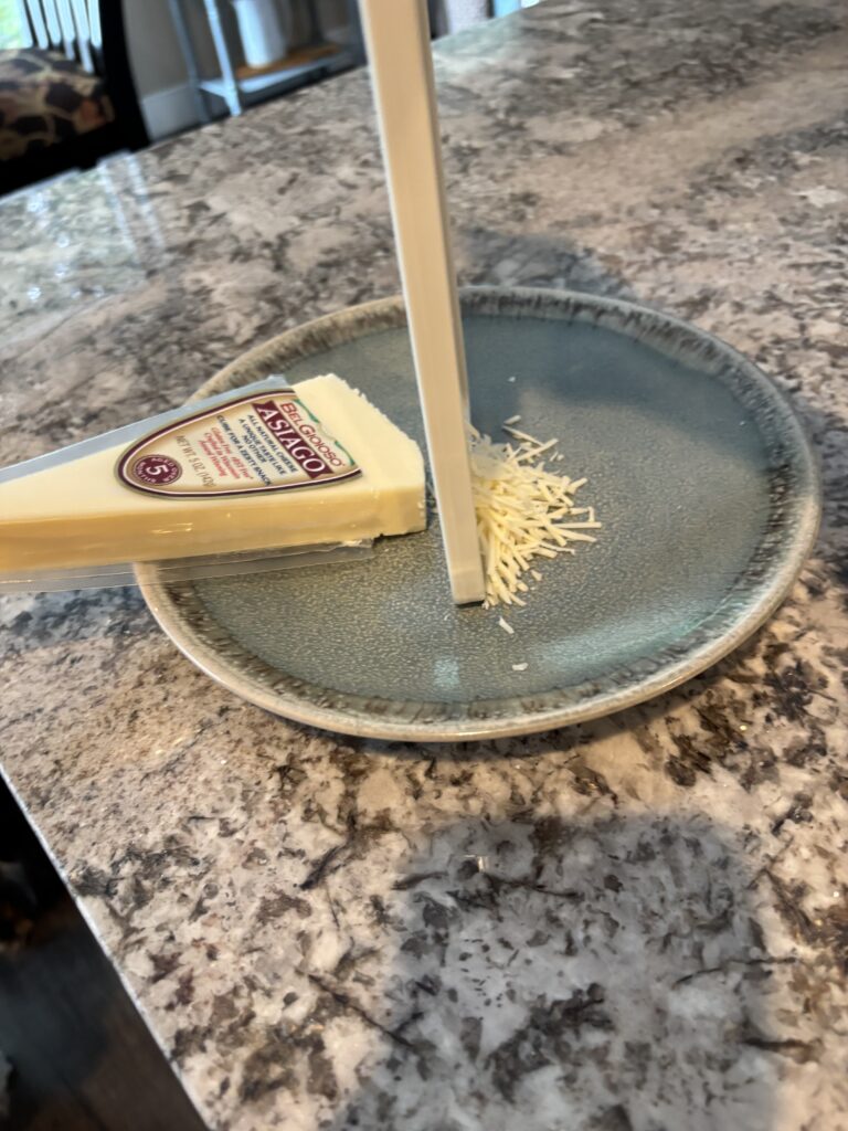 I am making Asiago cheese bagels today. Grate the cheese, then add it to the tops of the bagels in the last 5-7 minutes of baking.